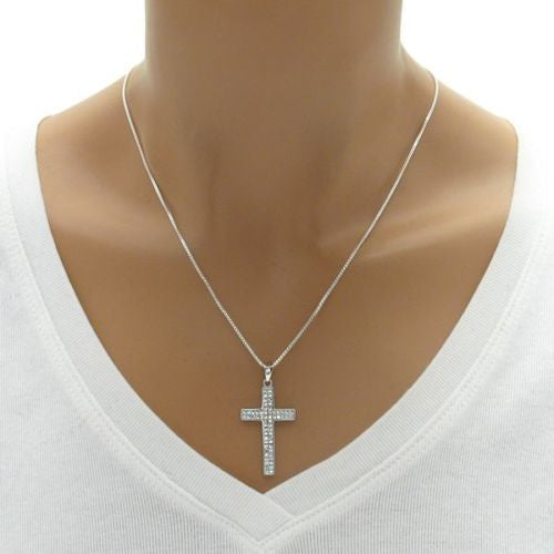 Dare to dazzle with this refined cross pendant with sparkly Cubic Zirconia stones carefully placed throughout the cross. Pendant only. Height: 1 7/16" or 36mm (including bail) Width: 11/16" or 18mm Bail...