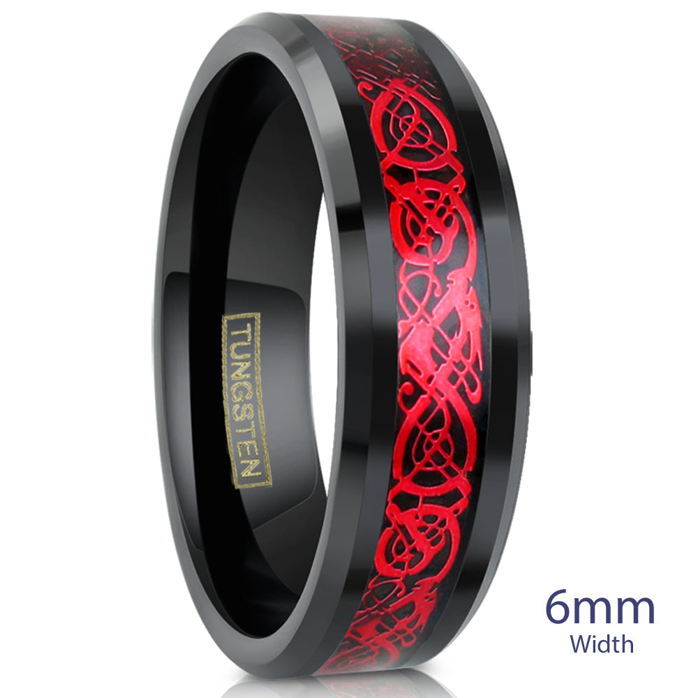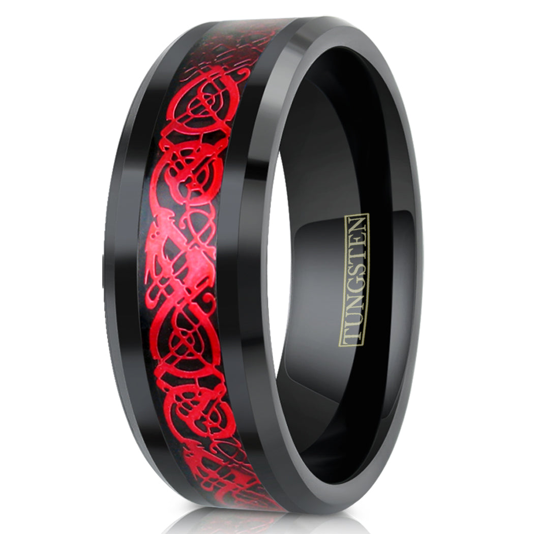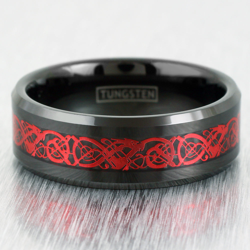 A brilliant ruby red Celtic dragon against a black background an elegant black tungsten ring. Beautiful, intricate, and complex. Beautiful contemporary ring in tungsten. Perfect for casual wear or special occasions. Superior...