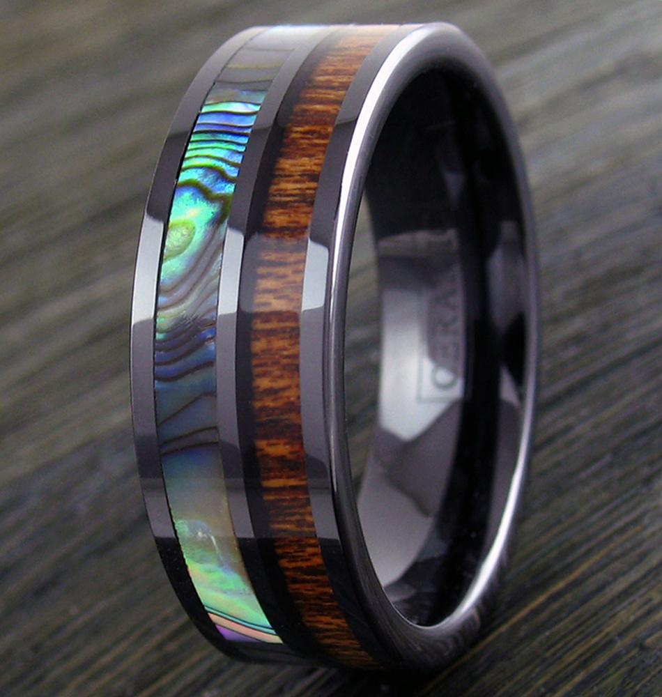 Modern stylish black flat band ceramic ring with a dazzling abalone inlay next to classy Koa Wood. Sublime. Beautiful and unique ceramic ring with abalone and Koa wood. Comfort Fit -...