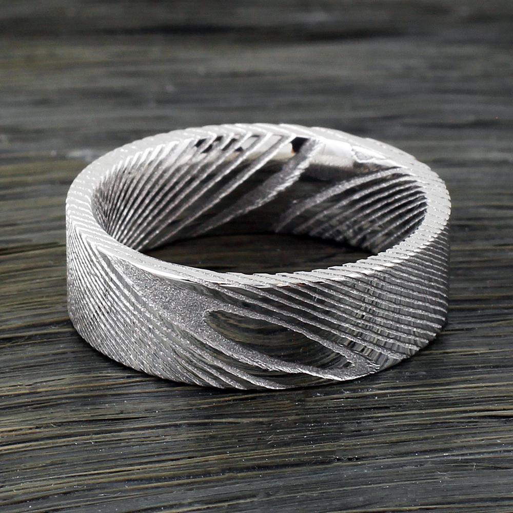 Beautiful 8mm Damascus Steel wedding band forged in a gorgeous wood grain pattern. Each Damascus Steel ring is unique and therefore, the pattern will vary. Beautiful modern ring in Damascus Steel....
