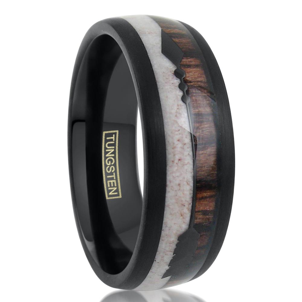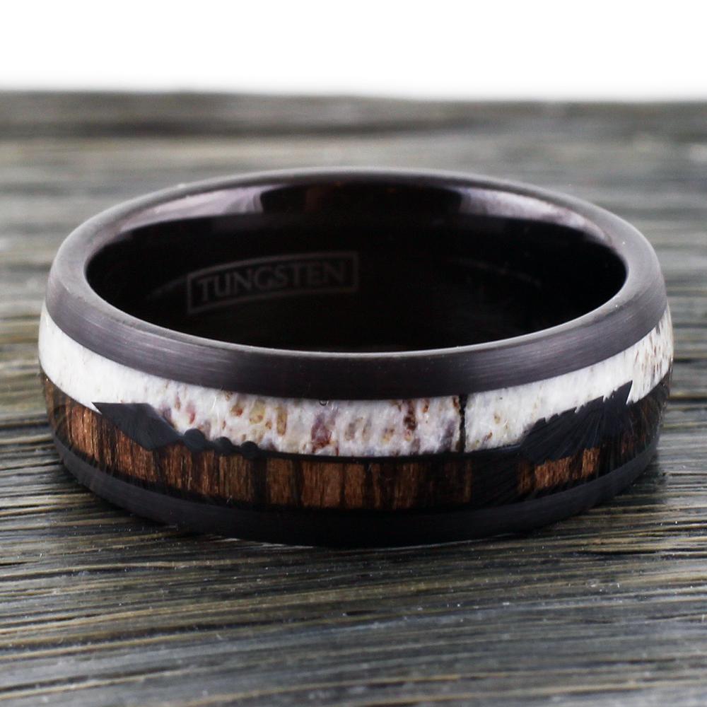 Elegant and stylish 8mm black tungsten dome ring with beautiful deer antler and Koa wood inlays overlaid with a lovely black feathered arrow. Beautiful modern ring in tungsten. Perfect for casual wear or...