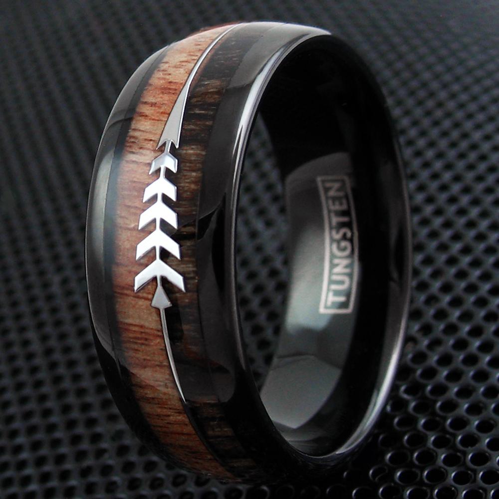 Awesome looking polished black tungsten dome ring with Koa wood inlay and a beautiful feathered arrow design overlay. Available in 6mm & 8mm widths. Perfect for couples! Beautiful and unique black...