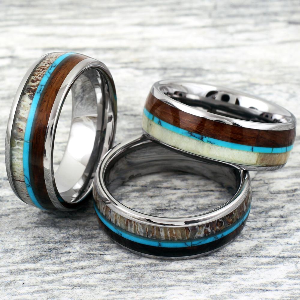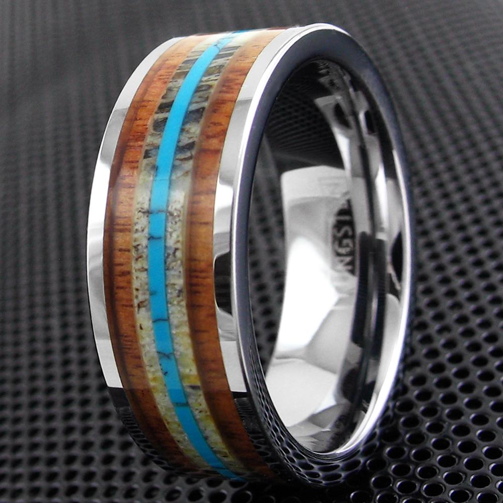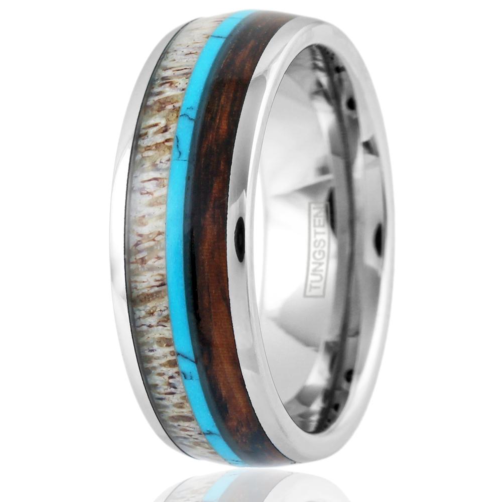 Brilliant and beautiful mirror polished natural silver tungsten dome ring with cool deer antler, turquoise, and Koa wood inlays. Beautiful and uniques silver tungsten ring with deer antler, turquoise, and Koa...