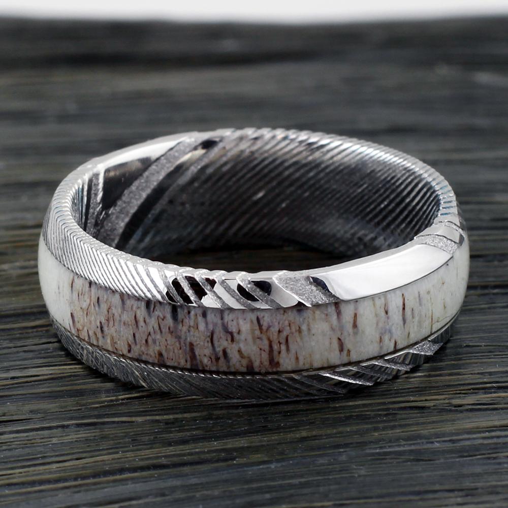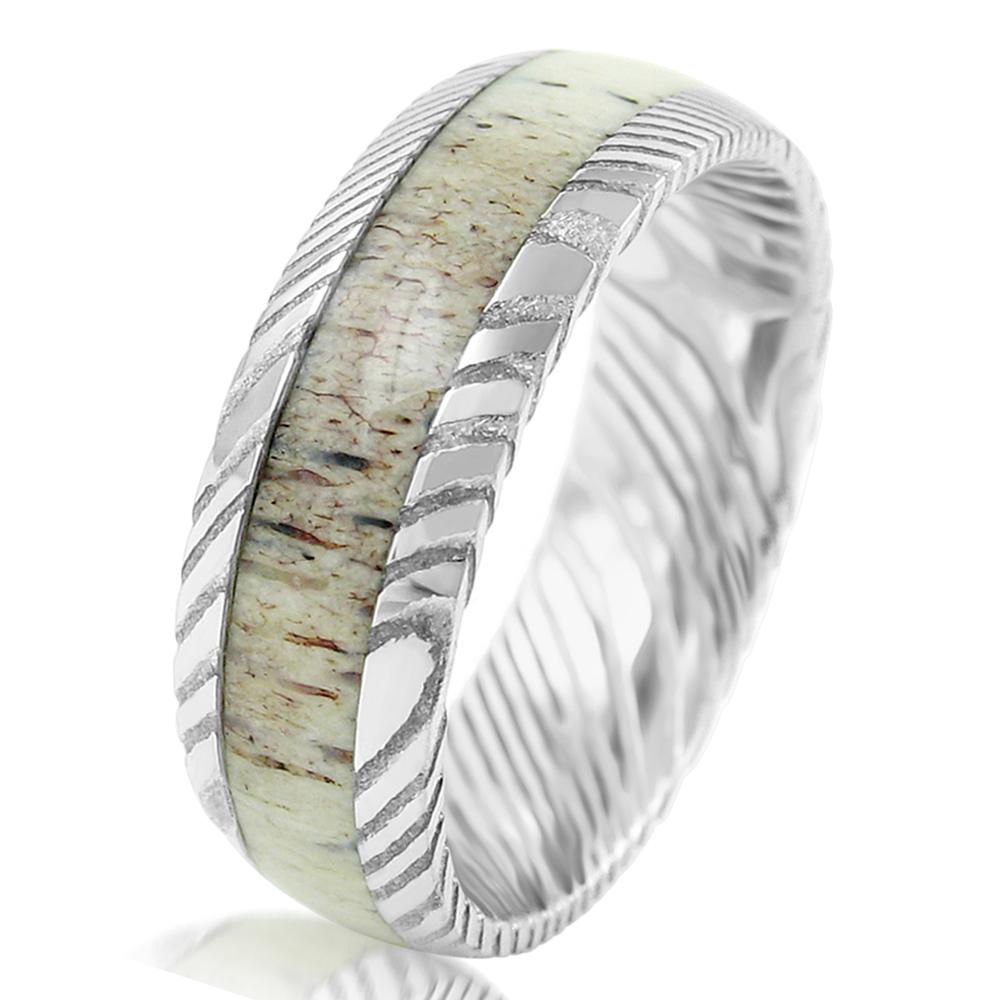 Marvelous 8mm Damascus Steel dome style wedding band forged in a gorgeous wood grain pattern with a lovely deer antler inlay. Each Damascus Steel ring is unique and therefore, the pattern...
